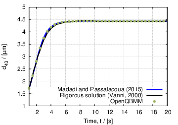 The time evolution of the mean particle size, calculated as d43 = m4/m3, where m3 and m4 are the third- and fourth-order moment of the number density function describing the particle size distribution, are reported below. The blue line represents the numerical solution obtained by Madadi and Passalacqua (2015), the black line is the rigorous solution from Vanni (2000), and the green dots are the prediction obtained with the EQMOM with log-normal kernel density functions available in OpenQBMM.